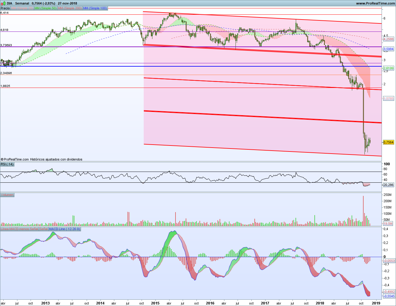 Este gráfico muestra la caída que ha venido desarrollando Día desde 2015, aunque acelerada desde 2017. Lo principal es ver el tridente bajista que tenemos y cómo la llegada a la parte baja del mismo ha frenado la caída.