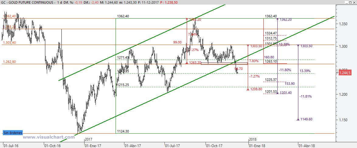 Oro: Análisis técnico 11 diciembre 2017. Ya hace más de un año que te puse un análisis del oro que se cumplió a la perfección. Según ese análisis, cuando el oro estaba por los 1.100 dólares, había que subir hasta 1.345 dólares antes de septiembre de 2016.