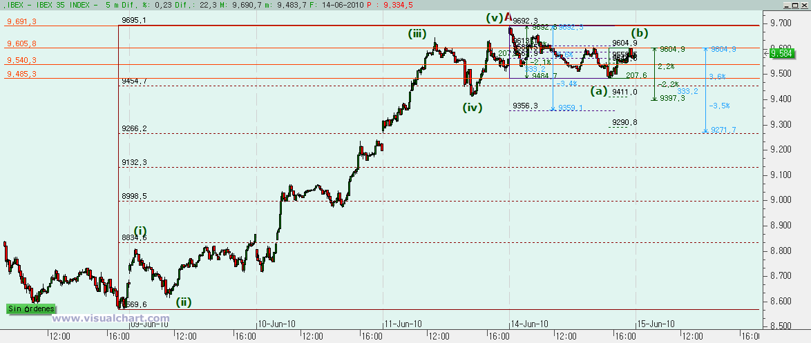 Hoy hemos abierto con gap alcista de nuevo, pero pronto se ha visto que no iban a seguir las alegrías, y menos en las inmediaciones de esos 9.720. Si nos fijamos en el gráfico desde que comenzó este último rebote, vemos que podríamos haber terminado la A de este rebote (ojo, decimos que podría haber terminado, pero se nos presentan múltiples posibilidades).