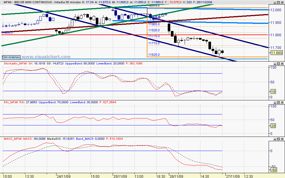 El objetivo de caída de la cuña ascendente estaba en los 11.700 y ese nivel lo alcanzamos ya casi a las 11. La pérdida del soporte intermedio de los 11.800 sin lucha alguna presagiaba lo peor. Y cuando este soporte se vio cómo se comportaba como resistencia tras el rebotillo en los 11.715 solo quedaba volver a caer.
