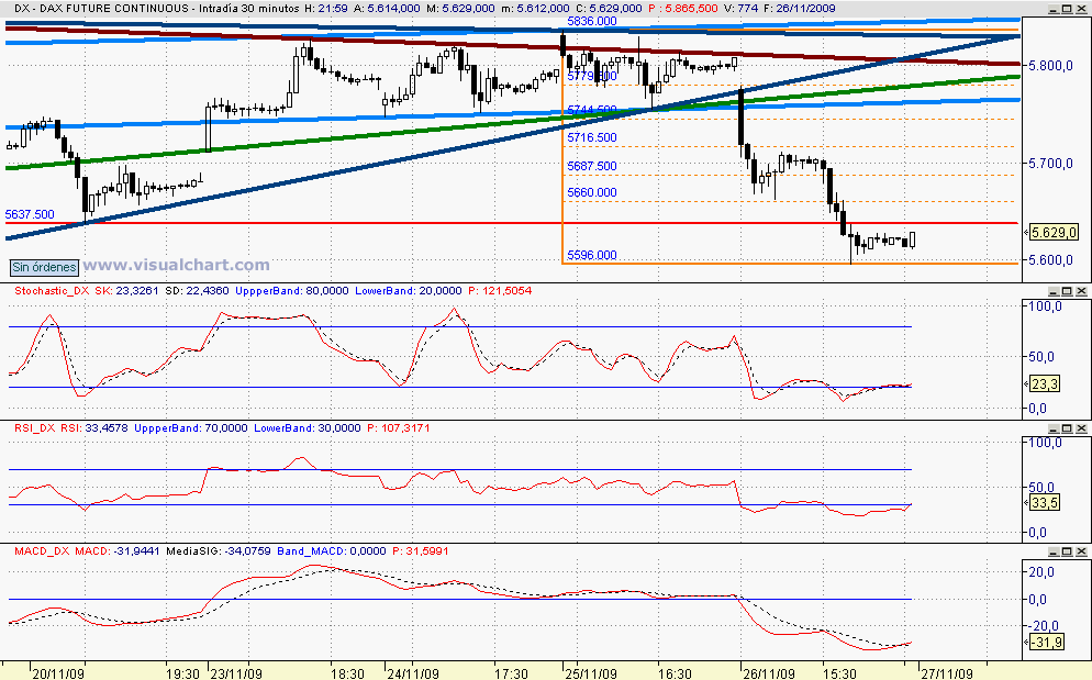 En cuanto al DAX, más de lo mismo. Hoy con la pérdida del nivel de los 5.746 que dimos el otro día, la caída estaba garantizado. Así, fuimos perdiendo soportes uno tras otro, hasta llegar al de los 5.600.