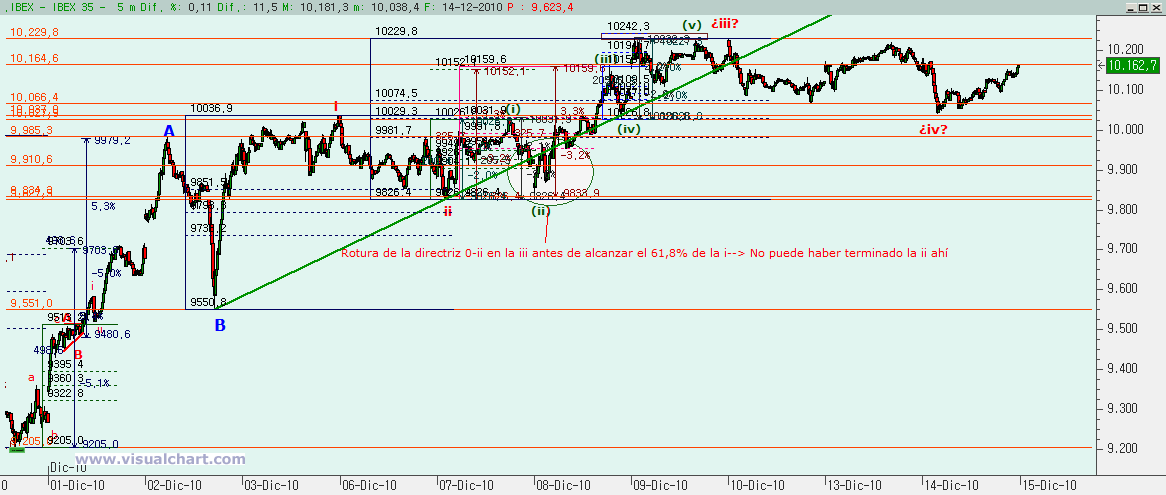 … pero hay dos datos que son muy interesantes. En primer lugar, el canal alcista que señalamos en uno de nuestros escenarios se ha roto por abajo…. Mala señal para mantener ese escenario… Si miramos el gráfico que pusimos el domingo para este escenario, vemos que la posible (v) de la iii no llegó al nivel previsto… Y no puede haber sido un fallo de (v) en una iii…. Luego la única opción posible para mantener el escenario es que siguiéramos en la (iv)…. Y sería completamente posible, ya que hemos rebotado antes del máximo de la (i)…. Con la salvedad de la rotura del canal alcista…. Eso sí, el rebote en mínimos de hoy se ha producido en el otro canal alcista que hemos señalado en azul… El caso es que este escenario pensamos que no es el bueno por la rotura del canal alcista, luego vayamos al otro…