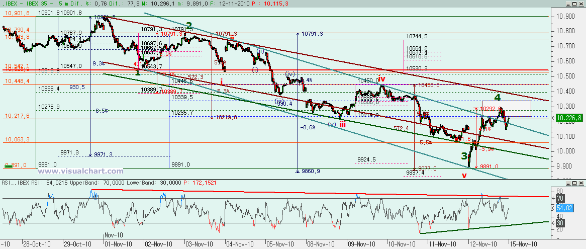 Psicoblog. Domingo 14 de Noviembre de 2010: Venimos señalando desde que comenzó el mes de Noviembre que parece que estamos formando 5 ondas bajistas desde entonces. El Jueves señalábamos que habíamos llegado al segundo objetivo para terminar la 3 y que podríamos ver la formación de la 4 alcista antes de terminar con una 5 bajista. Sin embargo, la apertura del viernes, con gap bajista severo nos llevó aún más abajo y nos dejó con la duda antes de rebotar con fuerza. Ahora tenemos varias posibilidades abiertas. Veámoslas.