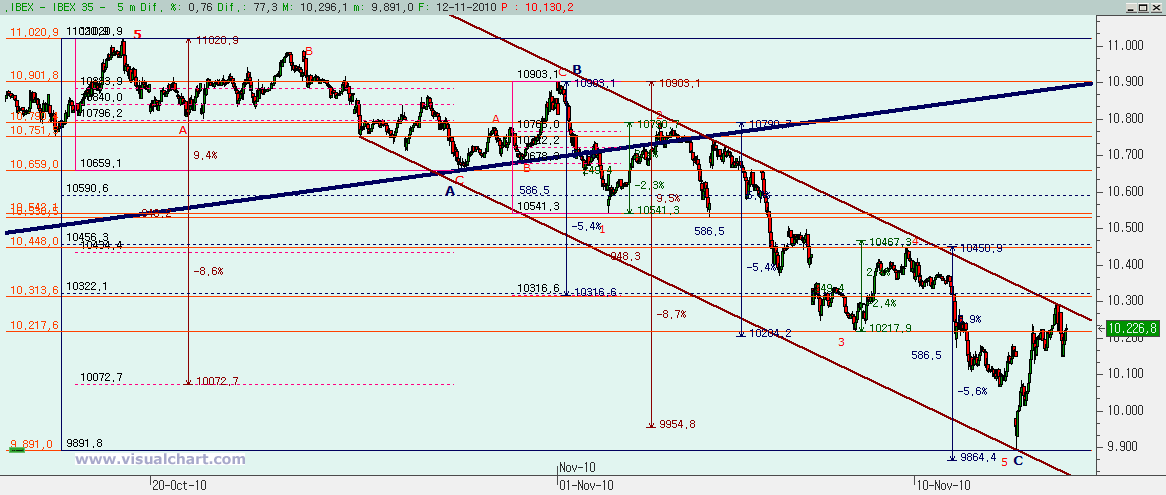Pero si abrimos un poco el gráfico para ver lo que ha sucedido desde los máximos del 19 de Octubre (sí, aquél día en el que parecía que íbamos a romper los 11.000, que era la cota clave y que, sin embargo, se ha mantenido con resistencia inquebrantable, lo que nos ha llevado hasta más de 1.000 puntos abajo en menos de un mes), podríamos pensar en una primera ABC bajista hasta mínimos de finales de Octubre, luego una ABC alcista y después 5 bajistas. Es decir, la primera ABC sería la A, la segunda la B y las 5 bajistas finales serían la C. Y la C habría sido un poco mayor incluso al 262% de la A. Pero esos niveles eran una zona muy clara para rebotar. Lo que ocurre es que antes habíamos dicho que podíamos haber terminado la 3 y estar en la 4. ¿Cómo es posible que podamos decir ahora que hemos terminado 5 bajistas? Pues porque los niveles también encajan. Si nos damos cuenta, la 3 habría sido igual al 162% de la 1. La 4 igual a la 2 y la 5 casi igual también al 162% de la 1. Luego este escenario es muy posible también.