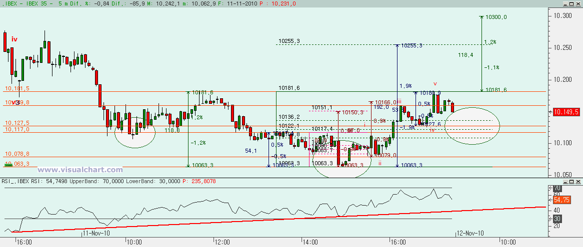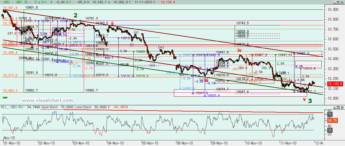 Psicoblog. Jueves 11 de Noviembre de 2010: En nuestro artículo de ayer volvimos a resaltar el recuento que venimos viendo desde comienzos del mes de Noviembre: 5 ondas bajistas desde entonces, estando en la v de la 3 de esas 5 bajistas, aunque también decíamos que podría ser que en lugar de la v de la 3, estuviéramos en la propia 5. El caso es que apostábamos más por la primera opción, por lo que se trataba de intentar decir dónde podría terminar esa 3. Señalamos un primer objetivo entre los 10.155-10.188 donde habíamos parado ayer, pero que nos parecía quedar una última parte de esa v, por lo que señalamos el siguiente rango objetivo entre los 10.020 – 10.092. Allí debería empezar la 4 alcista. Y en el medio de ese rango, en los 10.063 hemos detenido hoy la caída, coincidiendo, además, con la parte baja del canal bajista. Luego el objetivo sería una 4 que nos llevara, tal vez, hasta la parte alta del canal bajista.
