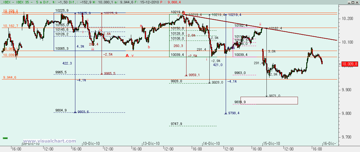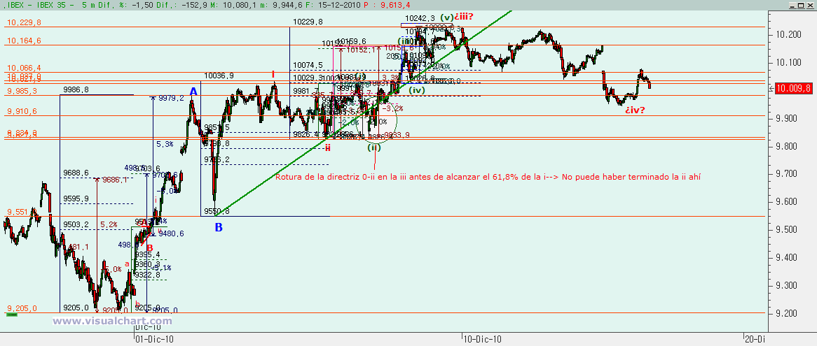 Psicoblog. Miércoles 15 de Diciembre de 2010: Desde que terminó el tramo de caída iniciado en los máximos de Octubre hemos venido intentando encontrar el recuento correcto para este rebote. Dijimos en su momento que lo normal era llegar a la zona de la 4 del impulso bajista previo, es decir, a la zona de los 10.400. Y si esto era un rebote, lo normal era hacer una ABC, aunque podríamos tener alguna otra forma más complicada de hacerlo. Tras la sesión de hoy seguimos sin llegar a descifrar el recuento correcto, pero vamos a intentar ver las posibles opciones.