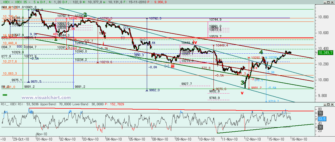 Pues bien, si nos fijamos en el gráfico de 5 minutos que venimos mostrando desde hace días, vemos que nos hemos quedado ligeramente por encima de la parte alta del canal bajista seguido desde comienzos de Noviembre. Esto podría indicarnos que no puede ser una 4. Pero debemos ser cautos y esperar una rotura clara de ese canal. Hoy, de momento, esa rotura no se ha producido con el filtro adecuado y, además, nos hemos parado en el que sería el retroceso del 50% del conjunto 1-3. Evidentemente, mientras no superemos el mínimo de la 1 (en los 10.542), no podremos asegurar que esto no es una 4. Pero la rotura del canal bajista sería una pista muy importante.