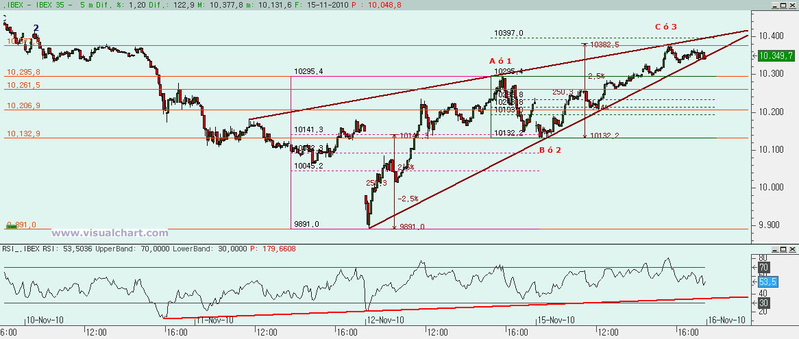 Psicoblog. Lunes 15 de Noviembre de 2010: Desde hace varios días hemos venido poniendo el recuento más probable para el último tramo de caída. Desde primeros de Noviembre hemos venido indicando que la caída se estaba haciendo en lo que podían ser 5 ondas. La duda ahora era ver si esas 5 ondas habían acabado o si lo que había acabado era la 3. El viernes llegamos a uno de los objetivos bajistas y tuvimos una señal alcista en el gráfico diario en forma de Reversal Day. Hoy se trataba de ver si se confirmaba esa señal alcista y, sobre todo, si podíamos comprobar si este rebote era una 4 o nos confirmaba que había terminado el tramo bajista.