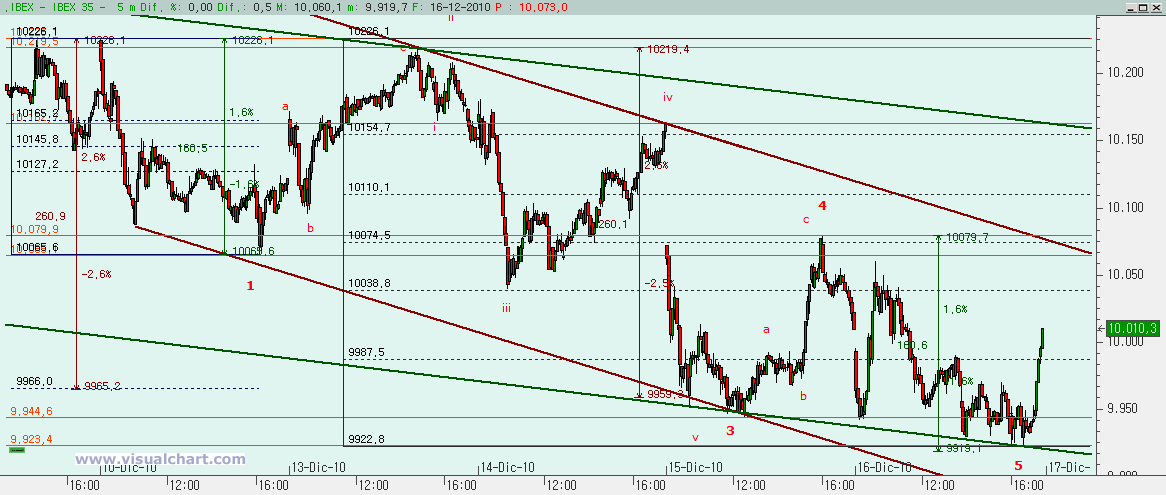 Psicoblog. Jueves 17 de Diciembre de 2010: Hoy hemos visto cómo hemos estado mareando la perdiz como suele ser habitual antes de los vencimientos. Mañana es el día y habrá que esperar cualquier cosa, pero, como el recuento desde mínimos del mes pasado sigue sin estar claro, vamos a intentar ver el recuento de muy corto para ver si mañana debemos esperar unos vencimientos alcistas o no y después ya intentaremos ver hacia dónde nos dirigimos. Vayamos con ello.