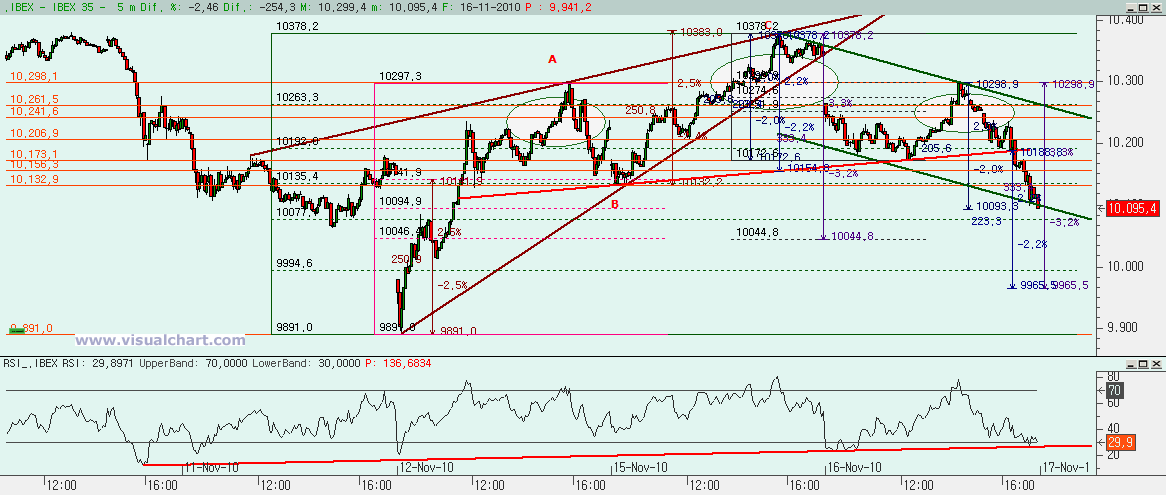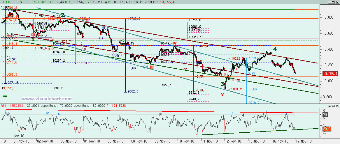 Psicoblog. Martes 16 de Noviembre de 2010: Desde comienzos de Noviembre hemos venido señalando la posibilidad de que estuviéramos formando 5 ondas bajistas. Las cosas han ido encajando hasta que llegamos a los mínimos del Viernes. Entonces hemos venido expresando nuestras dudas sobre si allí terminó la 3 y el rebote posterior es la 4 o si allí terminó la 5 y el rebote iniciado allí era algo más. Hoy seguimos teniendo la duda, pero puede que tengamos alguna pista que nos ayude…