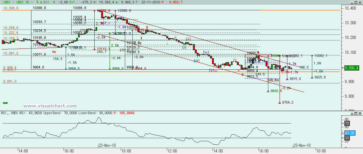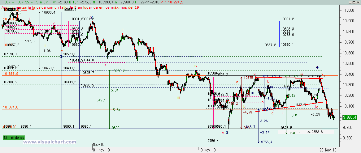 Psicoblog. Lunes 22 de Noviembre de 2010: Ayer señalábamos dos posibilidades en el recuento desde los máximos de Octubre, una que nos decía que habríamos hecho una ABC como corrección total y otra que debíamos ver 5 ondas, con lo que tras terminar la 3, estaríamos en una 4. La primera opción nos parecía menos probable por la rotura de la directriz alcista desde mínimos de Junio y la pérdida de soportes importantes, pero no habría que descartarla. Hoy, con la caída que hemos sufrido, parece que la opción correcta es la de 5 ondas bajistas desde esos máximos de Octubre. Veamos lo que nos dicen los gráficos.