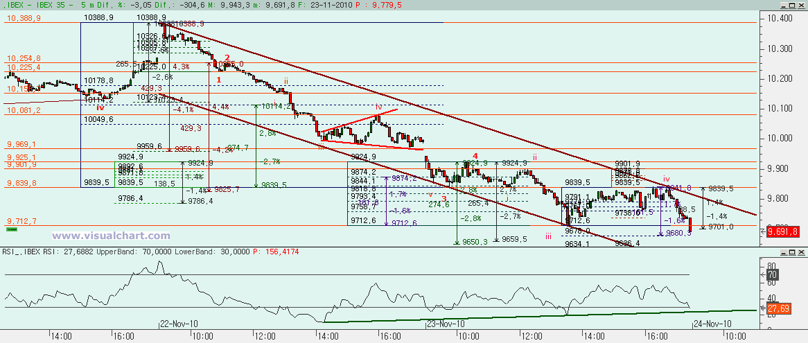 Si miramos el gráfico desde que comenzó la caída en los máximos de Octubre, vemos la existencia de las 5 ondas bajistas, con la 5 empezando en los máximos del lunes. Y nos damos cuenta de que el primer objetivo para esta 5, que estaba entre los 9.841 – 9.878, fue pulverizado esta mañana. El segundo objetivo que teníamos en los entornos de los 9.760 también lo hemos perdido. Y ahora tenemos el siguiente rango de objetivos entre los 9.549 y los 9.637. También vamos a fijarnos en la parte baja del canal bajista que tenemos de unir la 2 y la 4 como posible punto de finalización de la 5. Y, no dejamos de lado la posibilidad de que la 5 sea al final igual al conjunto 1-3, lo que daría un objetivo en los 9.291. Como tenemos tan amplio rango, vamos a intentar hacer un zoom en esta 5 para ver hasta dónde puede llegar.