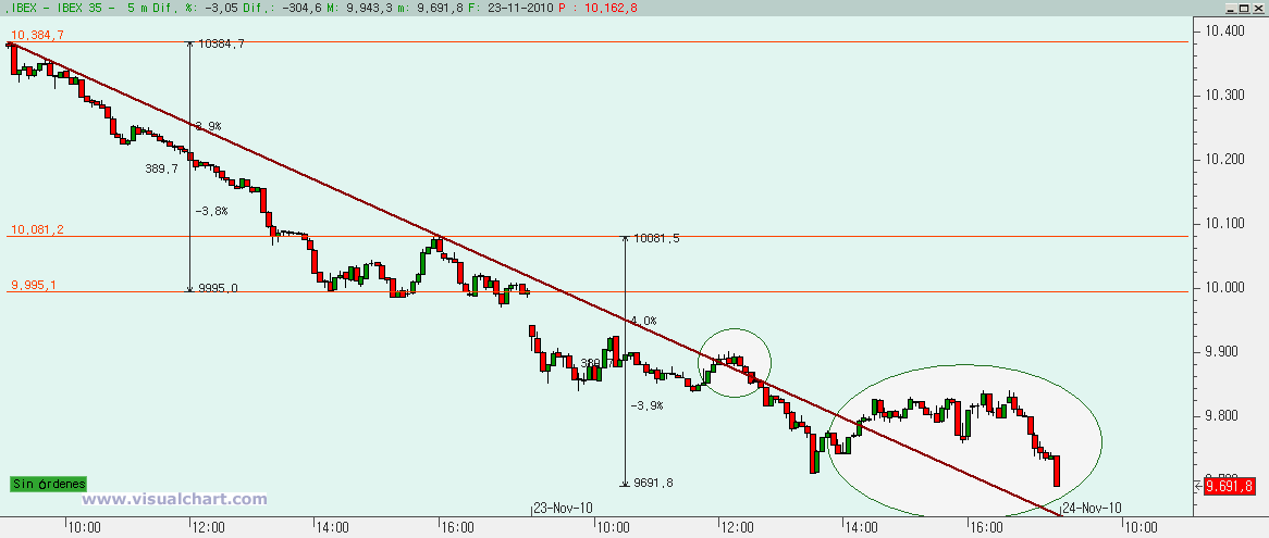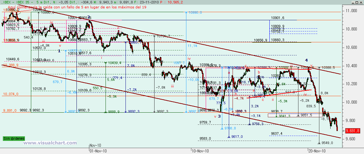 Psicoblog. Martes 23 de Noviembre de 2010: Por si alguien tenía alguna duda al respecto, el recuento desde los máximos de Octubre nos dice que esta caída se está produciendo en 5 ondas. Días atrás decíamos que aún existía la posibilidad de que la caída fueran 3 ondas, aunque la pérdida de la directriz alcista desde mínimos de Junio y la pérdida de niveles de soporte importantes parecían decirnos que la opción más fiable eran las 5 ondas. La caída es tan poderosa, que hoy hemos perdido el primer rango objetivo para la 5, y el segundo… Luego habrá que buscar el siguiente, teniendo en cuenta que, al producirse la caída en 5 ondas, esto no es una corrección, sino el inicio de una caída mayor. En el momento en el que la 5 termine y veamos un rebote, hay que tener en cuenta que después deben venir otras 5 bajistas. Tengámoslo en cuenta. Pero, primero, vamos a ver si podemos dar una zona donde pueda terminar la 5 y veamos un rebote.
