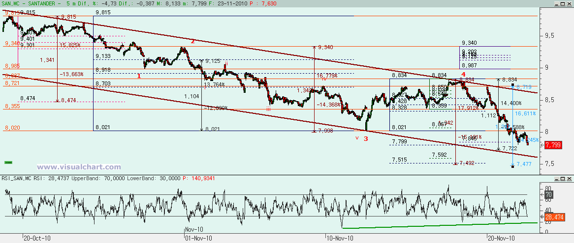 Pero si miramos, por ejemplo, el gráfico del Santander vemos las mismas 5 ondas bajistas, con la 3 igual al 162% de la 1 y ahora la 5. Una 5 que ha cerrado hoy justo en el retroceso del 127% de la 4. Y es que tenemos un primer objetivo para la 5 entre los 7,72 y los 7,845, es decir, ya en donde hemos cerrado hoy. Pero parece que la 5 no está completa, al menos la forma así nos lo dice… Por ello podríamos ir a buscar el siguiente rango que estaría entre los 7,477 y los 7,592. Por tanto, atentos porque aunque pudiéramos rebotar en esta zona un poco, podríamos ir a visitar la siguiente zona objetivo por abajo.