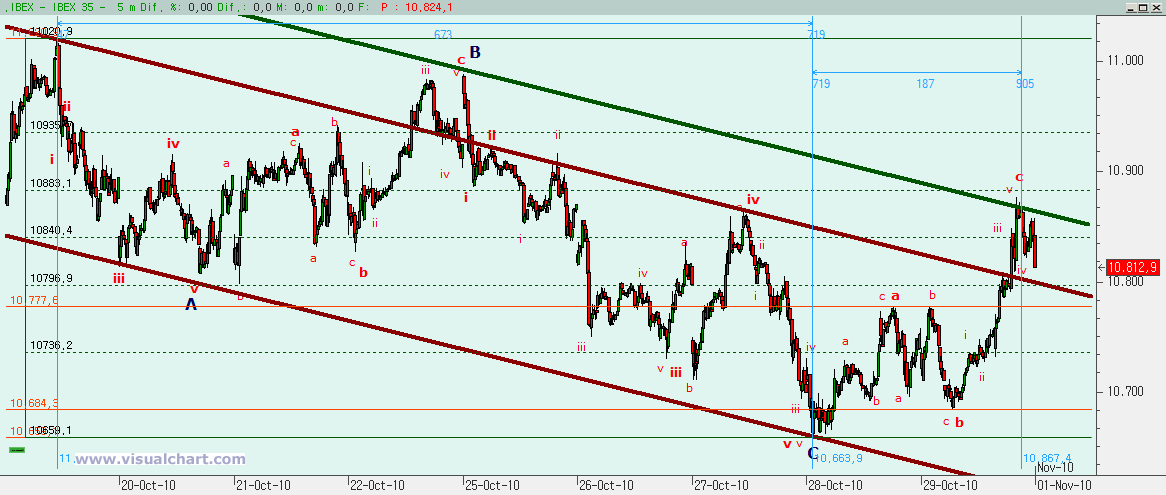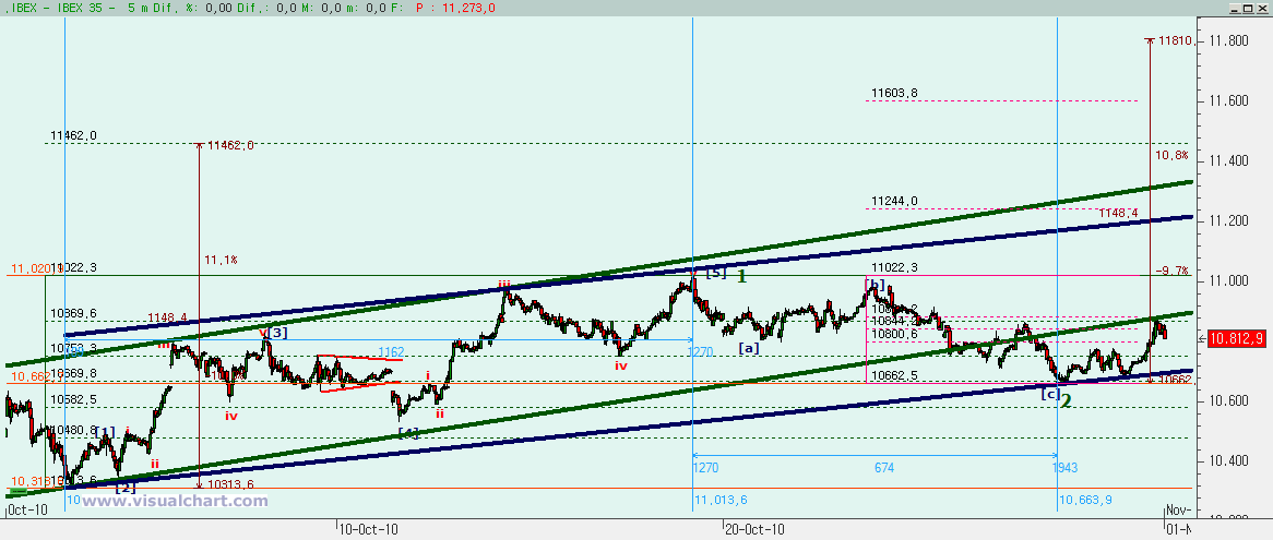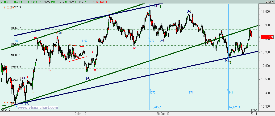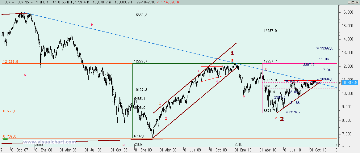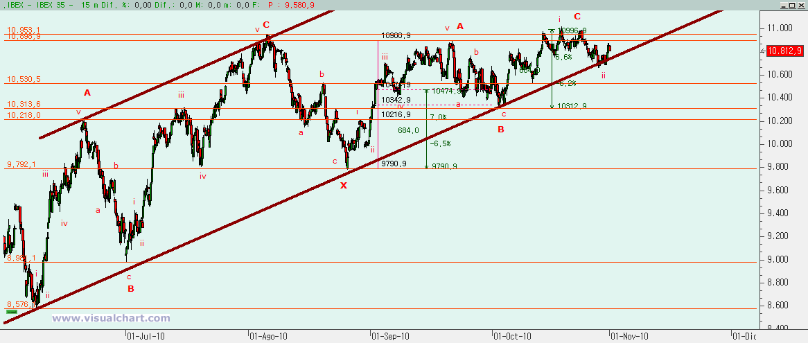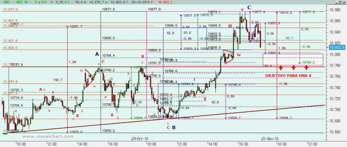 Psicoblog. Viernes 29 de Octubre de 2010: Ayer, tras el comienzo de un rebote en la zona señalada para ello, dijimos que había que prestar atención a varias cotas. Primero a la posible formación de un triángulo. Esto pronto vimos que quedaba descartado. Luego a los máximos de ayer. Y vimos que a la primera no se pudo con ellos. Y luego a los 10.807. Y ahí fuimos, paramos y lo superamos. Todo ello nos dice que la caída desde los máximos de Octubre no son 5 ondas (al menos según nuestro recuento), sino que han sido 3, por lo que esto debe ser una corrección y no el inicio de un impulso bajista. Otra cosa es que la corrección haya terminado, porque puede ser que sólo hayamos visto la primera parte. Veamos lo que nos dicen los gráficos.