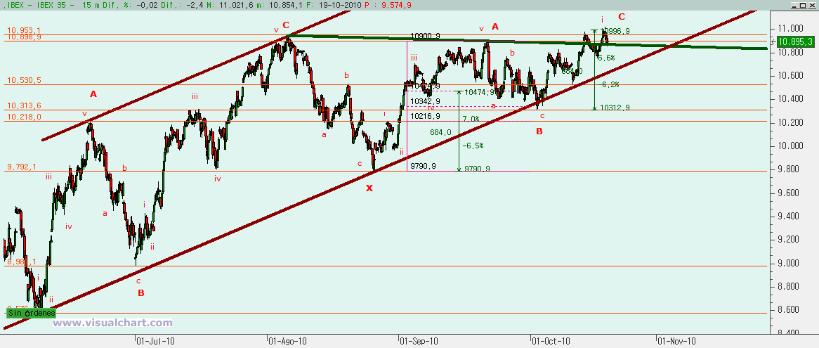 Psicoblog. Martes 19 de Octubre de 2010: Llevamos ya algún tiempo diciendo que los recuentos se están haciendo cada vez más complicados. En el Ibex tenemos varias opciones a medio plazo y ninguna es sencilla. Y es que desde los mínimos de este año no hemos sido capaces de ver un movimiento impulsivo. Pero tampoco ningún recuento correctivo sencillo. Por eso nos hemos tenido que ir a recuentos complejos, de los cuales los que mejor encajaban eran una doble combinación y un doble zig-zag.