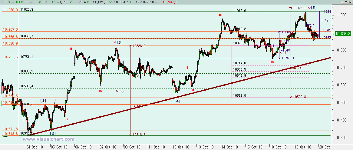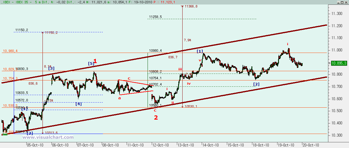 Si vemos el gráfico, los máximos de hoy habrían sido la i de la [3] de la 3. Si así fuera, no se podrían perder los 10.754 bajo ningún concepto, y el objetivo de la [3] estaría en los entornos de los 11.480. Pero recordemos que esos 10.754 no pueden perderse. Si se pierden, entonces esto no puede ser la [3] de la 3. Y aún más, la directriz alcista que sale de unir el origen de este impulso con la 2 (los mínimos) es clave para ver si este recuento es bueno. Si se pierde esa directriz, entonces no puede ser que la 2 haya terminado. Una de dos, o nos vamos al gráfico anterior que nos dice que hoy hemos terminado 5 ondas que serían la 1 y ahora comenzamos la 2 o bien nos vamos a la opción de que hayamos terminado el tramo alcista y comencemos tramo bajista.