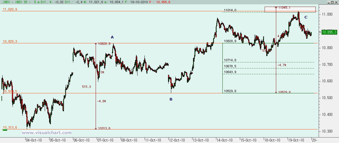 Y ahora se trataría de ver si hemos acabado aquí o no. Las ondas del triángulo deberían formarse en 3 subondas. ¿Podría ser esto la E completa? Veamos el gráfico de la posible E, es decir, desde el rebote iniciado el 4 de Octubre. Vemos que podemos trazar tres ondas, una ABC, y con la C que ha llegado al sitio justo: El retroceso del 162% de la B nos daba un objetivo en los 11.014. El punto que hacía la C igual a la B era la cota de los 11.045… Luego entre medias podía terminar la C y hemos terminado ahí.
