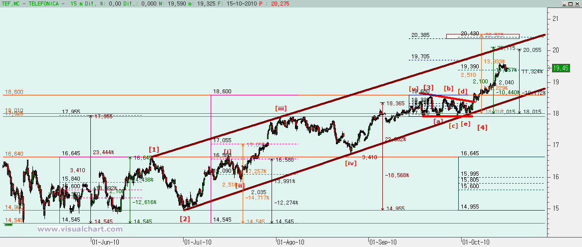 Por último, sólo nos queda hacer un último zoom para ver la que sería la v de la [v] de la 5. Es decir, la última alcista antes de terminar el impulso alcista y ver una corrección de gran calado. Si así lo hacemos, vemos que también se han formado ya 4 ondas y que estamos en la [5]. Y si tratamos de ver el objetivo para esta [5], tenemos que el primero estaría entre los 19,39 y los 19,71 (retroceso del 262% de la [2] y retroceso del 262% de la [4]). Pero parece poco. Por ello, el primer rango objetivo de importancia estaría entre los 20,05 y los 20,12 (que harían la [5] igual al 50% del conjunto [1]-[3] e igual a la [1]). Y el siguiente rango estaría entre los 20,38 y los 20,53 (donde tendríamos el retroceso del 362% de la [4], el 324% de la [2] y la cota que haría la [5] igual al 162% de la [1]).