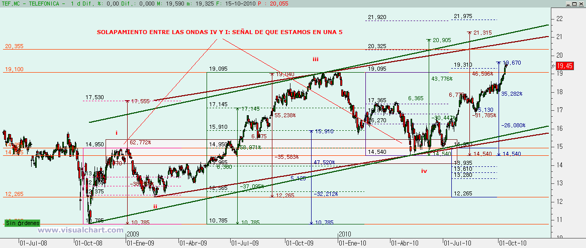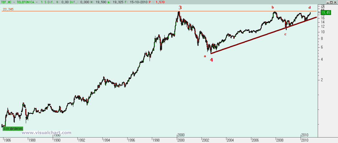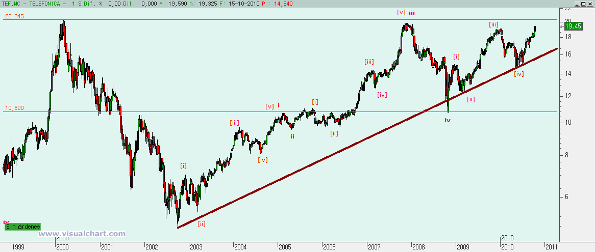 Psicoblog. Sábado 16 de Octubre de 2010: Si hay un valor que ha estado tirando del carro del Ibex durante los últimos tiempos (y cuando las cosas han ido mal, más aún), éste ha sido Telefónica. Por tanto, conviene que le echemos un vistazo a su gráfico para ver qué es lo que podemos esperar del valor y lo que va a afectar al Ibex. Para ello vamos a echar la vista atrás primero para después ir acercándonos al presente.