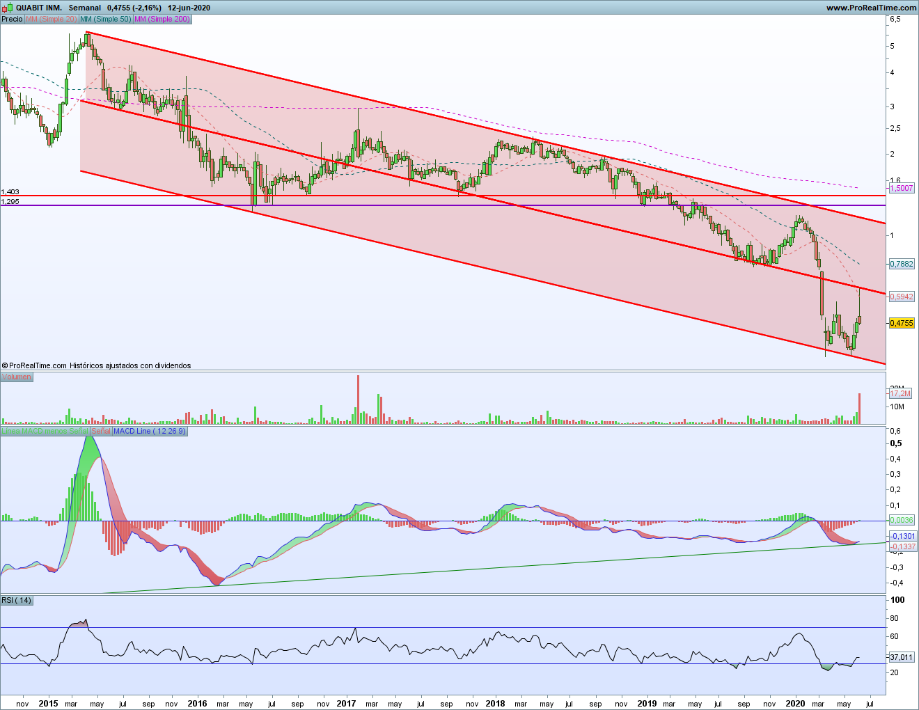 Quabit es uno de esos valores bajistas que no se han recuperado desde la crisis de 2007. La tendencia bajista es de manual. Pero es que la perfección del gráfico es tal que parece de tiralíneas.