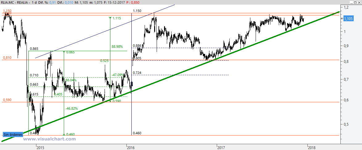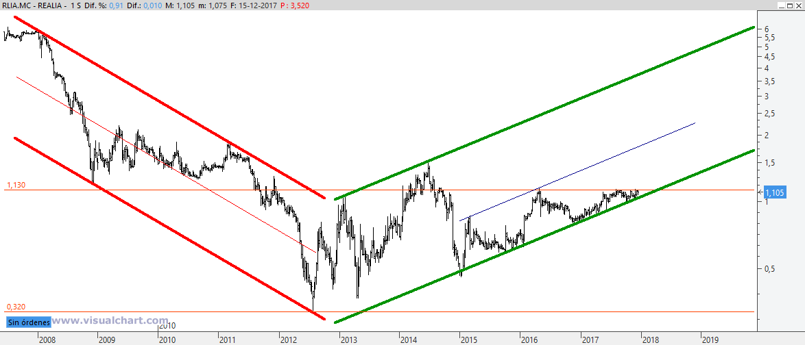 Realia: Análisis técnico 16 diciembre 2017. Hoy vamos a revisar el gráfico de un valor que se encuentra en una situación muy interesante: Realia. Aquí tenemos uno de los claros ejemplos de empresa inmobiliaria que no ha levantado cabeza desde el estallido de la burbuja.