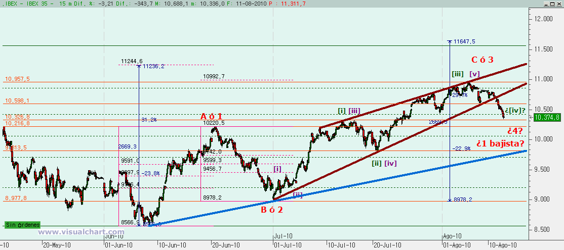 Bien, el caso es que dijimos que había dos niveles a tener en cuenta. Por abajo la zona de los 10.210, que era el máximo de la que podría ser onda 1. En el gráfico hemos señalado los posibles recuentos. Y tras el cierre de hoy estamos cerca de poder testear los niveles por abajo. Si el recuento bueno fuera el marcado en verde (para las subondas de la 3 o C), entonces esta caída podría ser la [iv]. Y para que fuera así, no se podría perder la zona de los 10.320 (máximos de la posible [i]). Si se perdiera esta zona, entonces habría que descartar este recuento e irnos al otro. El que marca las subondas de la posible 3 o C en morado. Eso indicaría que la 3 o C habría terminado y entonces ya la zona de control total sería la de los 10.210. Si se perdiera esa cota, entonces esto subida habría sido correctiva en ABC y tocaría volver a caer para desarrollar un nuevo impulso bajista. Esto activaría el escenario más bajista. Si se respetara esa cota y nos fuéramos hacia arriba, los alcistas aún tendrían esperanza.