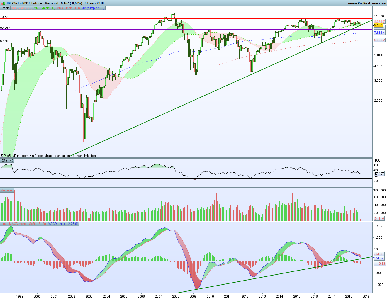 Pero también debemos mirar el gráfico del futuro del Ibex, porque también puede darnos muchas pistas y decirnos muchas cosas interesantes. Y lo primero que podemos ver es que estamos justo en la alcista que viene desde mínimos de 2002. Tras no poder con la resistencia horizontal roja marcada por los máximos de 2015, hemos vuelto directamente a esa alcista.