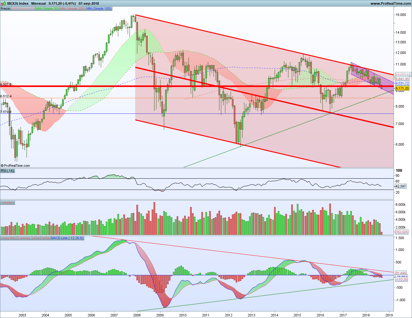 Aquí puedes ver tanto el tridente que manda desde 2007 como la línea horizontal que rige desde 2010. La parte alta del tridente es la que ha frenado la subida en 2015 y desde el máximo de 2017. Lo hemos podido comprobar en varias ocasiones, las últimas a principios de año.