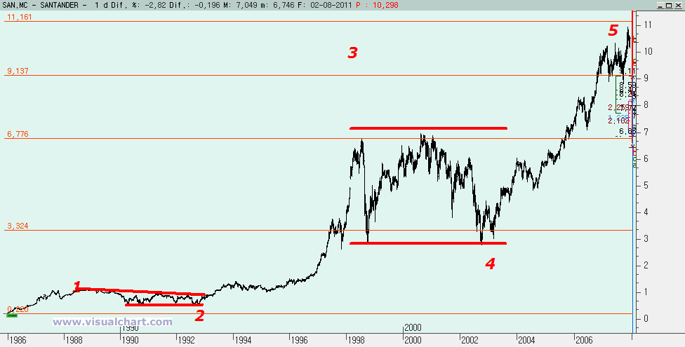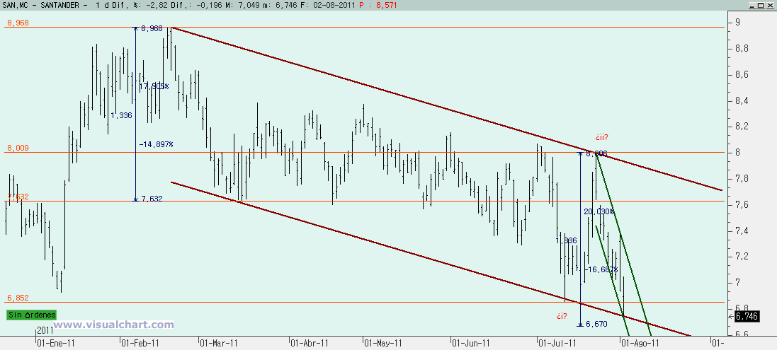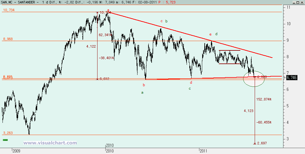 Martes 02 de Agosto de 2011: Visto el momento tan importante que estamos viviendo ahora mismo en las bolsas y, especialmente, en nuestro Ibex, no viene de más echar un vistazo a uno de los pesos pesados de nuestro selectivo, el Santander, que se encuentra en un momento crítico también, y ahora veremos por qué.