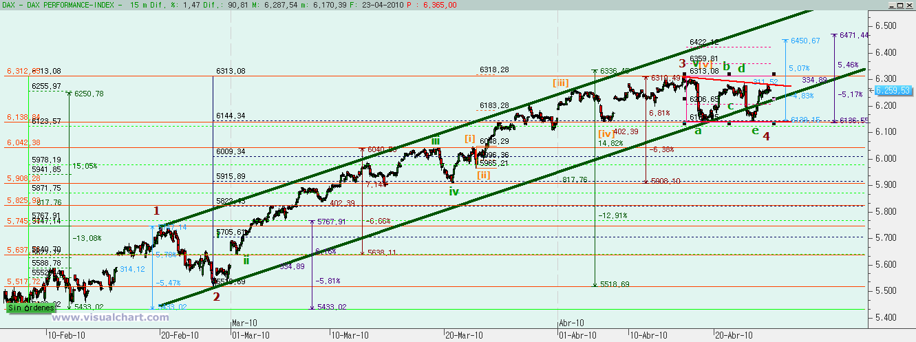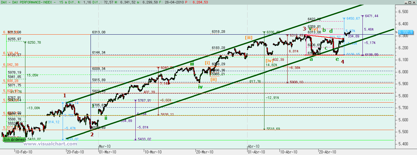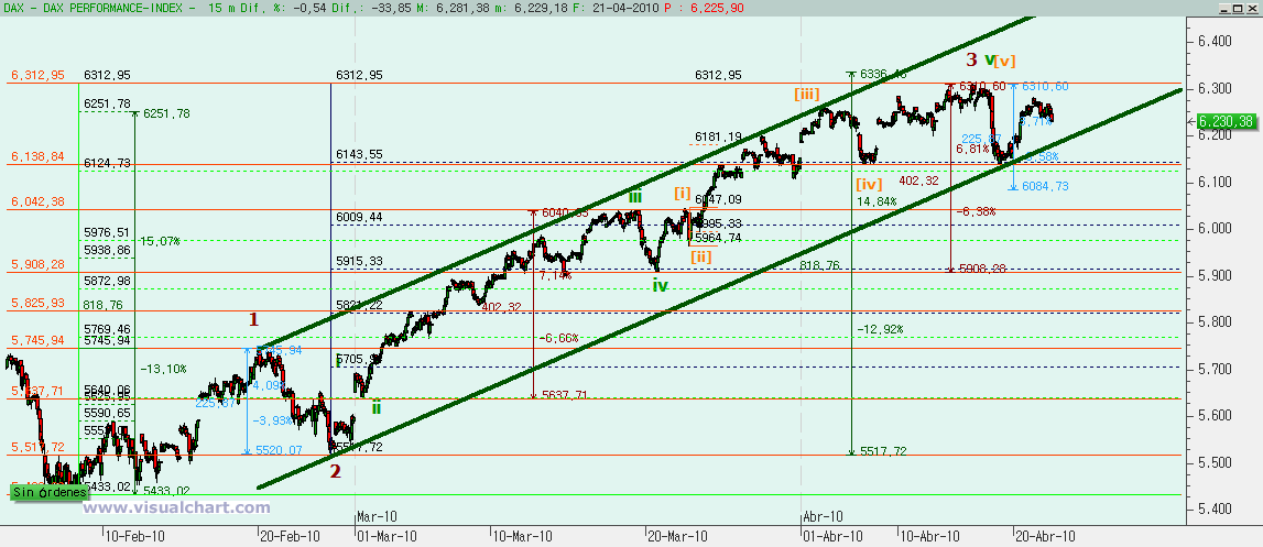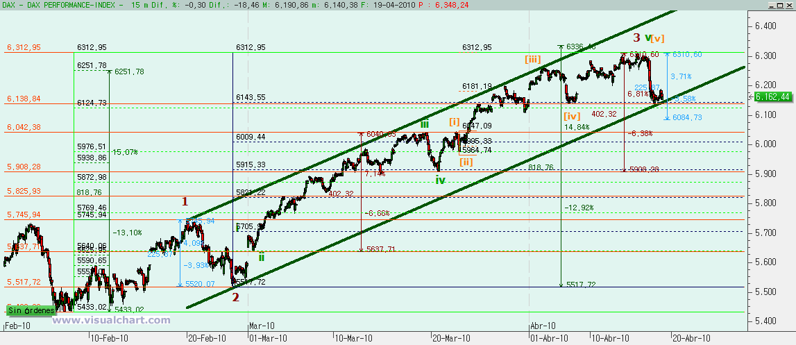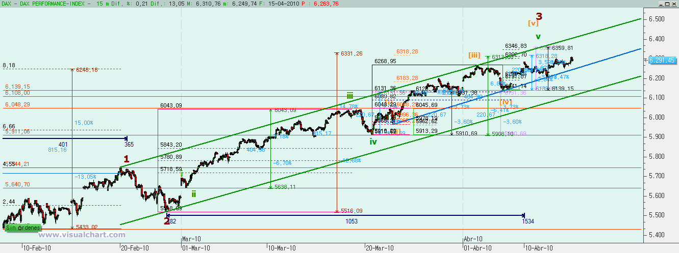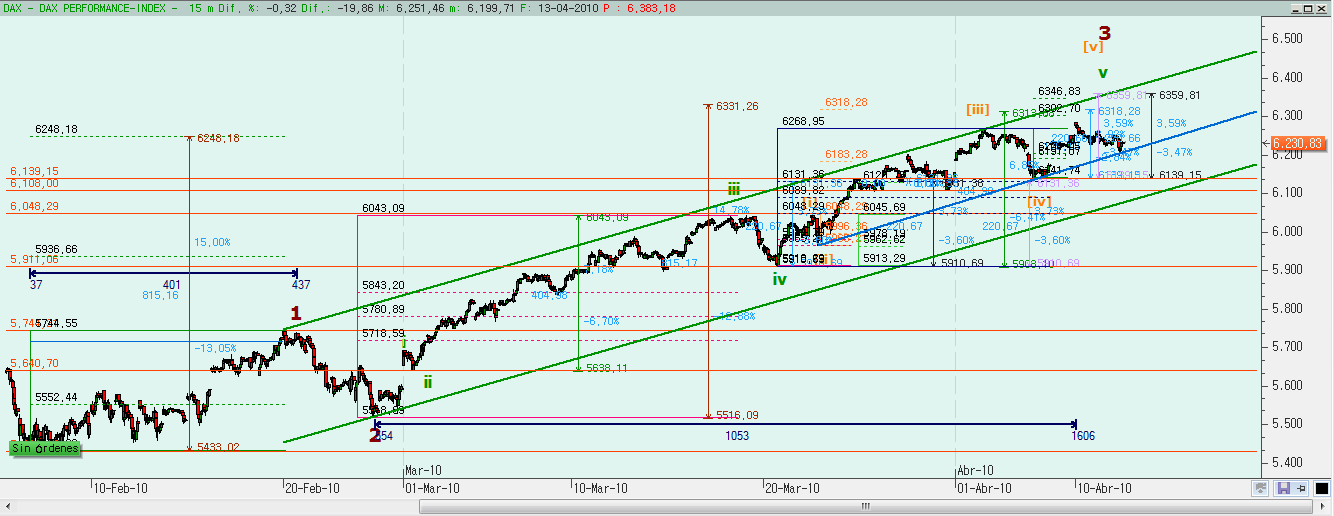 En octubre de 2014 tuvimos el final de la última corrección de importancia del DAX y comenzamos un nuevo impulso alcista. Desde entonces hicimos una onda 1 inicial y luego una onda 2 con fallo de c, lo que explicó la fuerte subida posterior para hacer la onda 3. El objetivo para la onda 3 que fuera igual al 162% de la onda 1 nos daba un 12.260 e hicimos un 12.223, es decir, que podemos aceptar pulpo como animal de compañía y marcar el final de la onda 3 en el máximo del 16 de marzo.