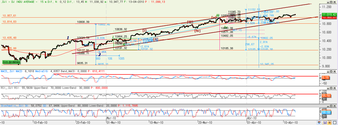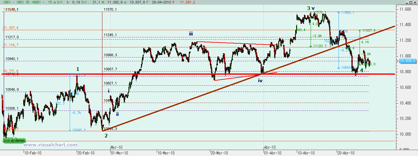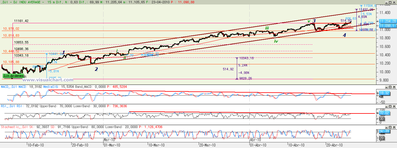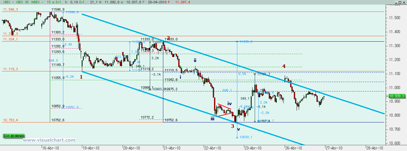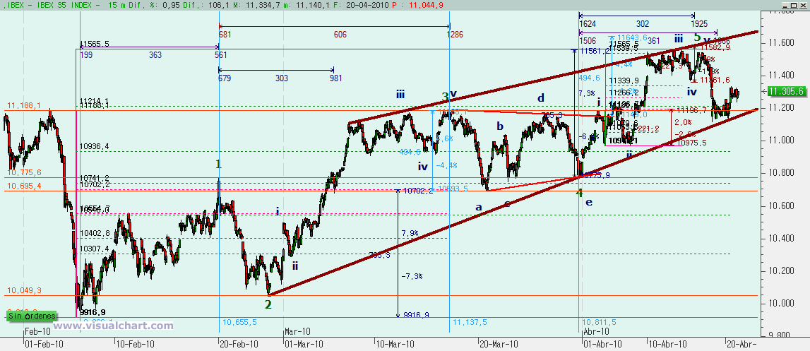Pues bien, desde entonces parece que lo que estamos haciendo es una onda 4 que se está desarrollando en forma de ABC con b fuerte. Esa b fuerte marcó el máximo semanal en lo que parecía el desarrollo de un nuevo impulso, pero no fue sino esa b fuerte. Y ahora estaríamos en la onda c de esa 4. Y lo normal es que el final de la onda c vaya por debajo del mínimo de la onda a. Además, la onda c suele llevar más tiempo que la onda a, con lo que al menos debería durar hasta el miércoles, ya que allí es cuando se cumple que la c dure lo mismo que la a. Y todo teniendo en cuenta que el 38,2% de la onda 3 está en el 11.137 y esa zona debería ser el objetivo para una onda 4.