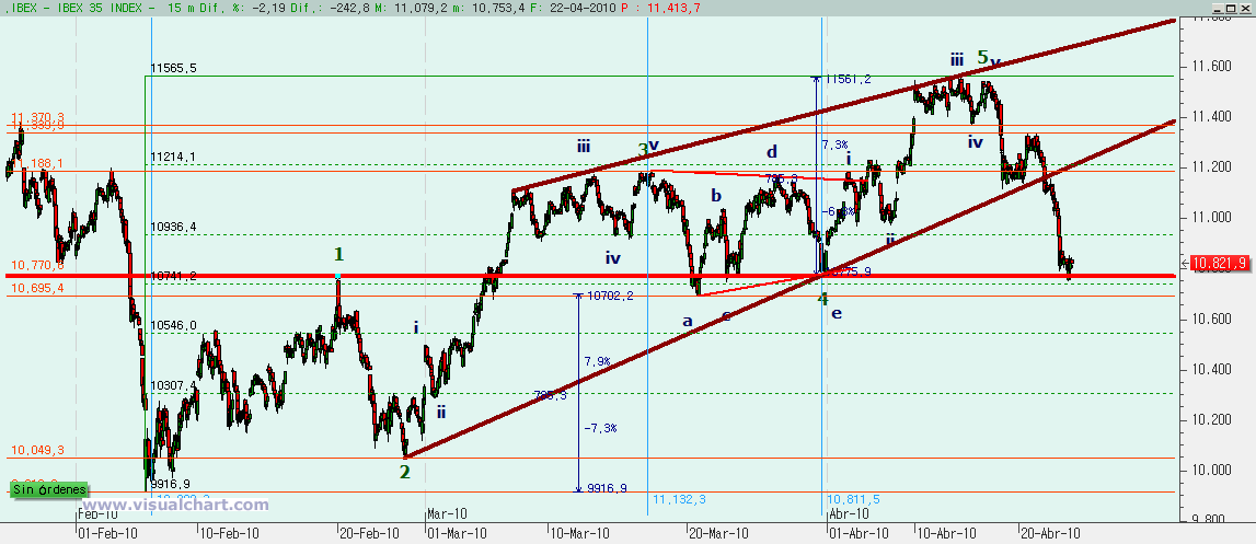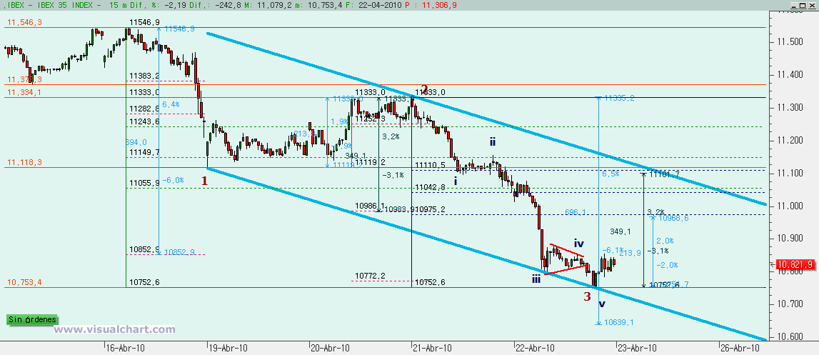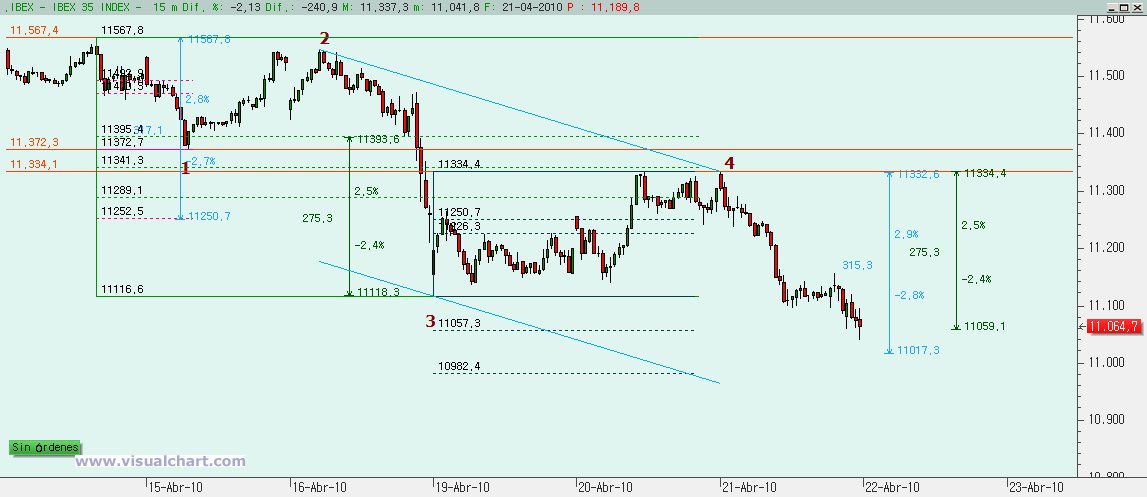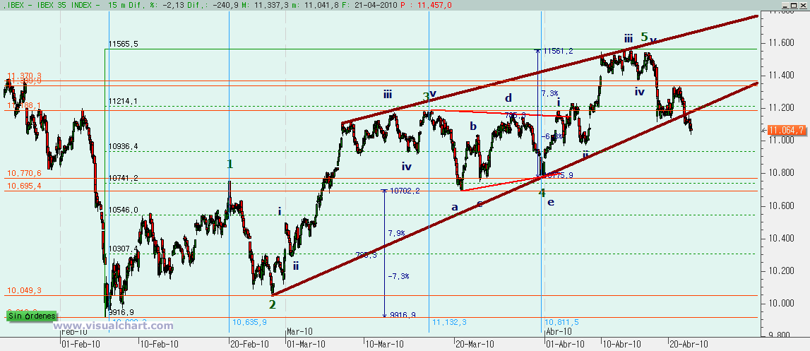 Si miramos el gráfico desde el máximo de marzo, cuando habría acabado la 3 del gráfico anterior, nos damos cuenta de que primero hicimos una A bajista en forma de canal con la c igual a la a. Después una B fuerte que se queda ligeramente por debajo del 138% de la A, lo que parece decirnos que la C va a ir por debajo de la A y ahora una C bajista.