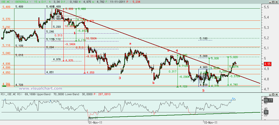 Iberdrola: Desde máximos de finales de octubre hemos hecho 5 bajistas claras con la 3 igual al 262% de la 1, la 4 totalmente diferente a la 2 y la 5 igual al 162% de la 1. Desde entonces debemos subir para corregir esas 5 bajistas, al menos hasta el 38,2% de esas 5 bajistas, es decir, hasta el 5,02. Eso es lo mínimo.