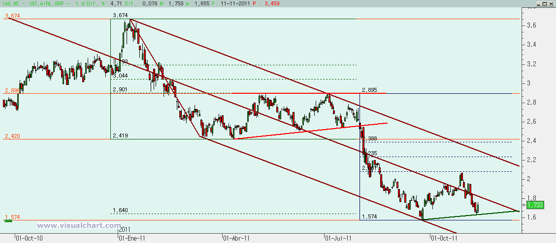 IAG: Canal y tridente bajista muy claro desde máximos de primeros de año. Primer impulso bajista hasta mínimos de abril, luego rebote hasta el 38,2% de la caída (formando un triángulo ascendente) y ahora estaríamos haciendo o habríamos terminado el tercero bajista. Tras el mínimo de septiembre el rebote también llegó al 38,2% del tramo y hay que ver si ahora hacemos el segundo tramo del rebote para ir de nuevo a la parte alta del canal bajista. Si queremos hacer ese segundo tramo alcista, la alcista verde no se debe perder. Luego por arriba primer nos fijamos en la parte central del tridente bajista y si se supera, atentos a la parte alta del tridente. Ahí se deberían cerrar los largos. Soporte en la alcista verde.