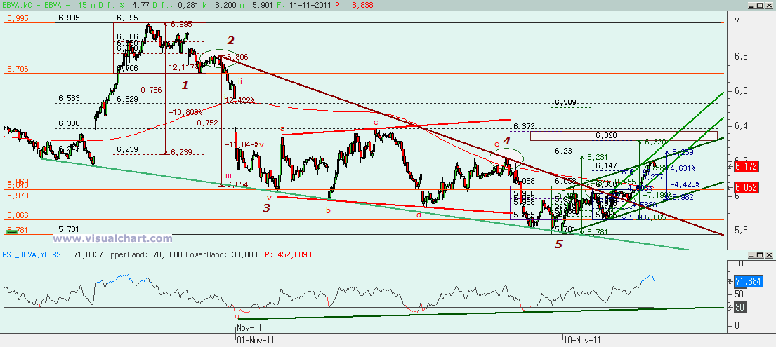 BBVA: Desde finales de octubre BBVA hizo lo que pudieron ser 5 bajistas, además formando lo que parece una cuña descendente. Como podemos ver en la imagen, movimiento de libro con la 3 igual al 262% de la 1, luego una 4 en triángulo expansivo y para terminar una 5 en la parte baja de la cuña. Divergencias alcistas desde la iii de la 3. Una vez que se rompe la bajista 2-4 se confirma que se terminaron las 5 bajistas. El rebote inicial se para en esa bajista y cuando rompe hace un throw-back y sigue subiendo. El 38,2% de toda la caída está ahí mismo, en el 6,243, y será el primer punto a vigilar.