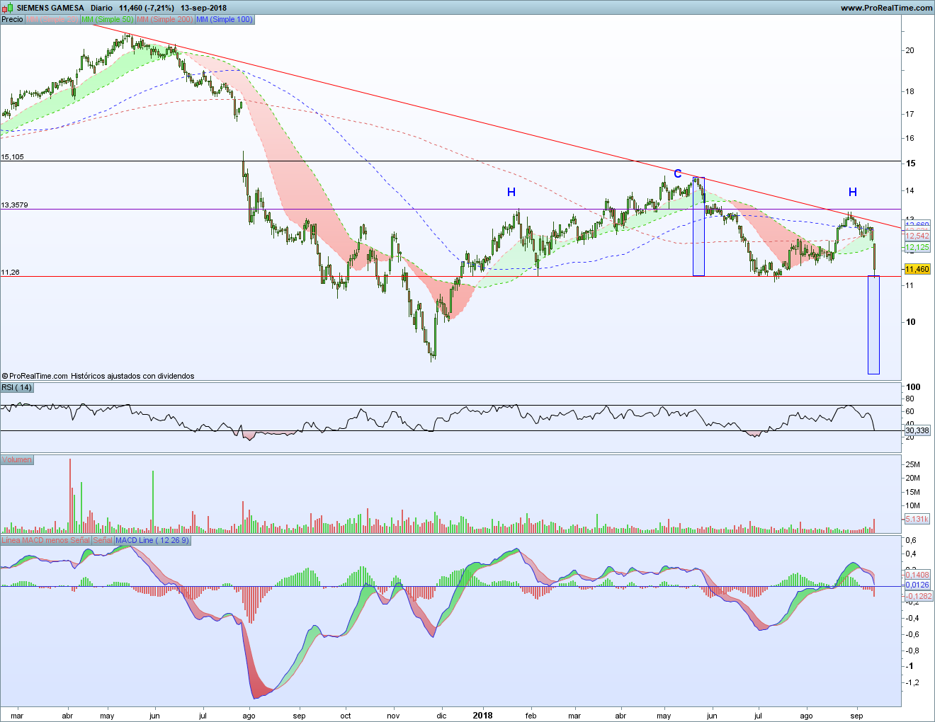 Pero es que hay algo más. Desde julio de 2016 el valor ha estado dibujando una figura de HCH muy clara, con la clavicular verde indicada. La semana pasada atacó esa clavicular y esta la está rompiendo con fuerza. Lo normal cuando se rompe un nivel. Esto confirmaría la figura y un objetivo bajista en la zona de los 7,60, cerca ya del soporte horizontal rojo.