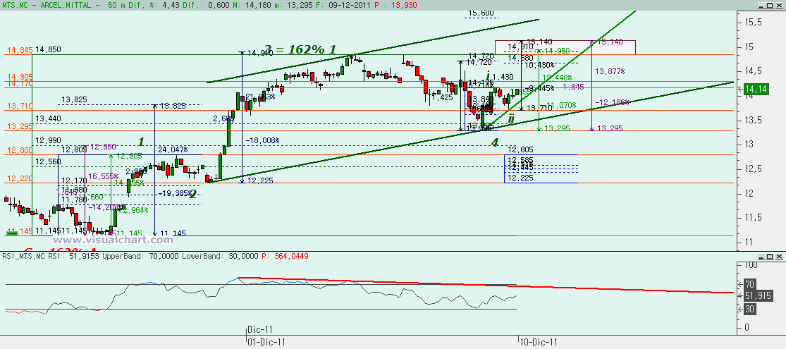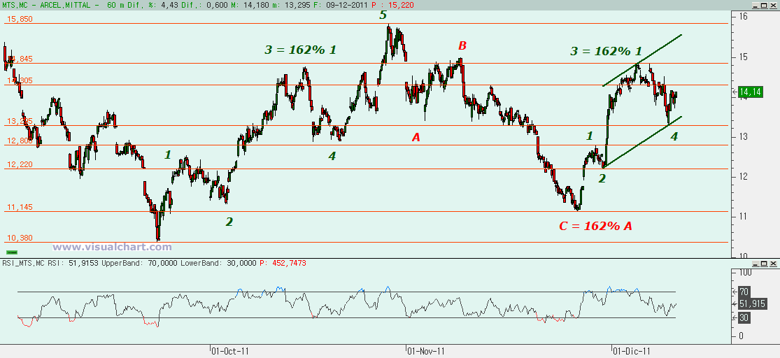 Arcelor Mittal: Arcelor Mittal lleva desde mínimos de septiembre una pauta que parece bastante clara. Desde mínimos de septiembre a máximos de octubre la subida se hizo en 5 alcistas, con la 3 igual al 162% de la 1. Después la corrección a esas 5 alcistas se hizo en forma de ABC con la C igual al 162% de la A. Es decir, estructuras muy definidas. Y, si la subida desde septiembre a octubre se hizo en 5 alcistas, deberíamos tener otras 5 después tras la corrección. Y parece que en eso estamos. Habríamos hecho ya hasta la 3 (que también habría sido igual al 162% de la 1) y la última corrección podría ser la 4. Por tanto, deberíamos tener que hacer la 5 arriba.