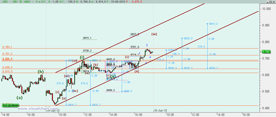 Por eso, vamos a intentar hacer el recuento desde que terminó la corrección esta mañana para intentar aprovechar a corto lo máximo posible. Si miramos el gráfico desde los mínimos de esta mañana, vemos que se han formado ya dos ondas, la (i) y la (ii) y que estamos ahora formando la (iii). Dentro de esta (iii), estaríamos formando la [iii] tras terminar la [i] y la [ii]. El primer objetivo para la [iii] lo tendríamos entre los 9.753 (si la [iii] fuera igual a la [i]) y los 9.761 (si la [iii] alcanzara el 262% de la [ii]). Como este rango lo hemos alcanzado ya hoy, lo suyo sería ir al siguiente. Y esa proyección para la [iii] lo tendríamos entre los 9.815 (retroceso del 262% de la (ii)), los 9.825 (si la [iii] fuera igual al 162% de la [i]) y los 9.837 (retroceso del 424% de la [ii]). Cuando terminara esta [iii] deberíamos ver un retroceso para formar la [iv] que no debería llegar más allá de los 9.685 (máximos de la [i]) y luego subida de nuevo para terminar con la [v] de la (iii). Para estimar la proyección de la [v] tendríamos que esperar a ver que se forme la [iv], pero una primera estimación podría estar en los 9.913 de tal modo que la (iii) fuera igual a la (i).
