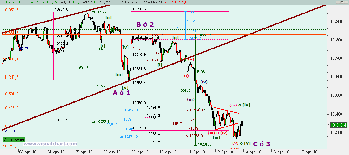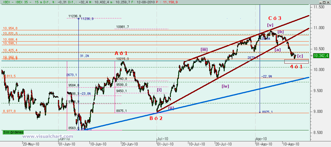 Pero si hacemos un zoom en el tramo de caída iniciado el día 5, vamos a intentar ver un poco más si definimos realmente la situación. Hemos dicho que por abajo son claves los 10.210 y sus entornos. Mientras no se pierda esta zona, esto podría ser sólo una corrección. Si así fuera, entonces vemos en el gráfico una primera A, la B y esta caída de ayer y hoy sería la C. La proyección que nos saldría para esta C estaría entre los 10.282 y los 10.231. Dentro de este rango coinciden varios puntos de posible finalización de la bajada. Los 10.282 coincidirían con el retroceso del 127% de la que sería la [iv] de la C. Los 10.278 harían la [v] de la C igual a la [i]. Los 10.273 harían esa [v] igual al 23,6% del conjunto [i]-[iii]. Los 10.243 el retroceso del 162% de la [iv]. Y los 10.231 que harían la C igual al 162% de la A.